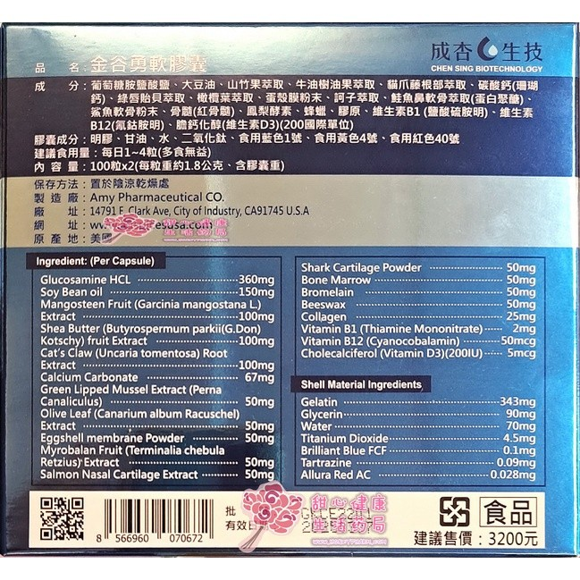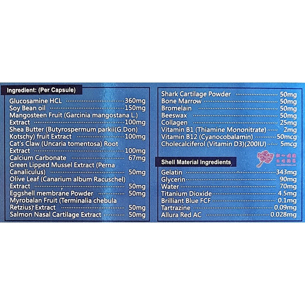 成分 : 葡萄糖胺鹽酸鹽、山竹果萃取、牛油果樹萃取、貓爪藤、碳酸鈣、綠唇貽貝萃取…