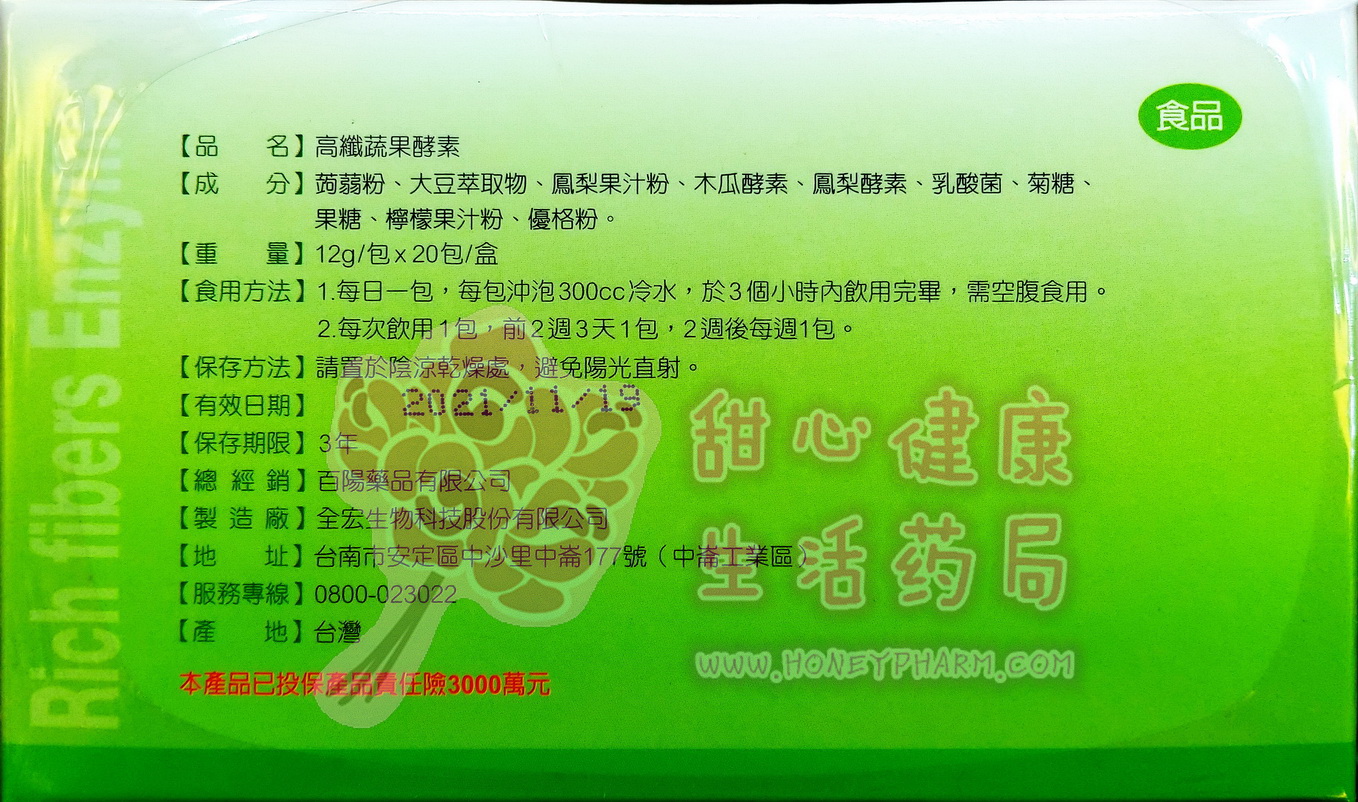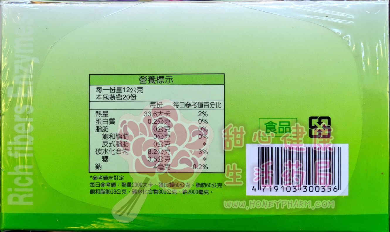 產品名稱 : 高纖蔬果酵素 用法 : 每次1包,沖泡後飲用 成分 : 綜合蔬果酵素 容量規格 : 20包/盒 營養標示 : 如圖所示 產地 : 台灣 效期 : 2年內 貨源 : 公司貨