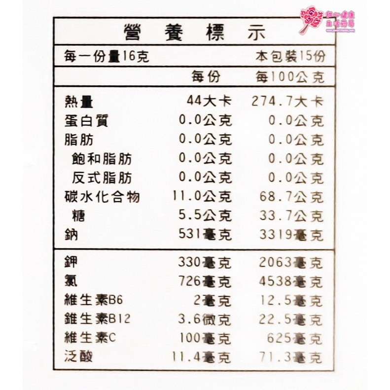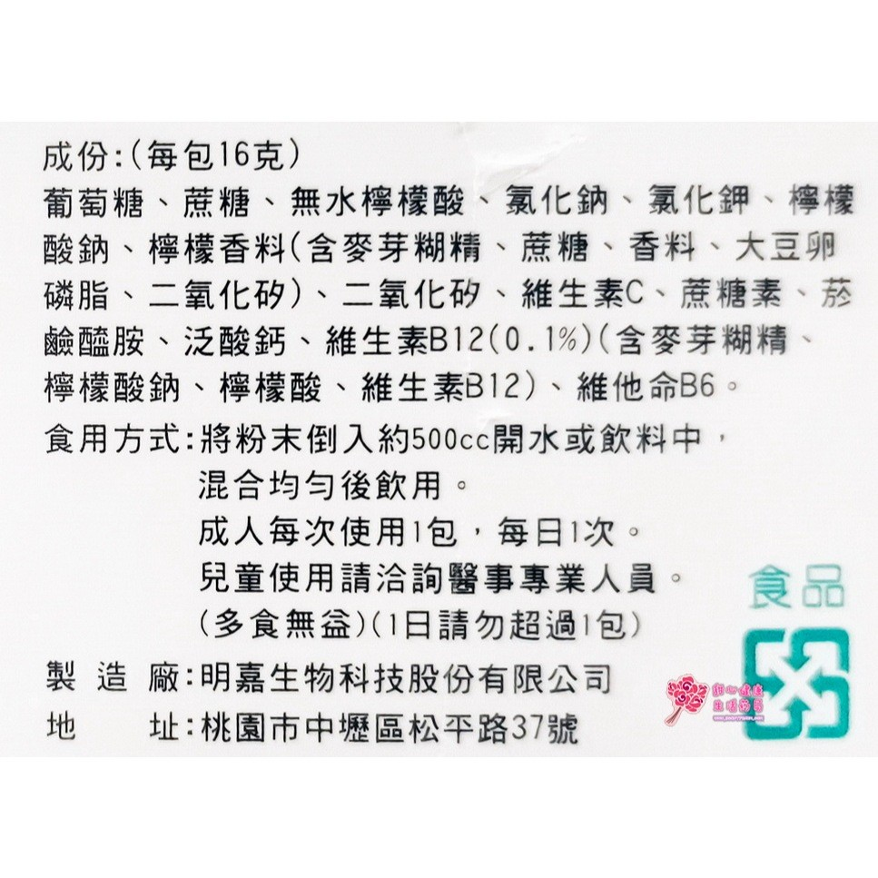 成分 : 葡萄糖、蔗糖、無水檸檬酸、氯化鈉、氯化鉀、檸檬酸鈉、檸檬香料、維生素C、維他命B6、維生素B12