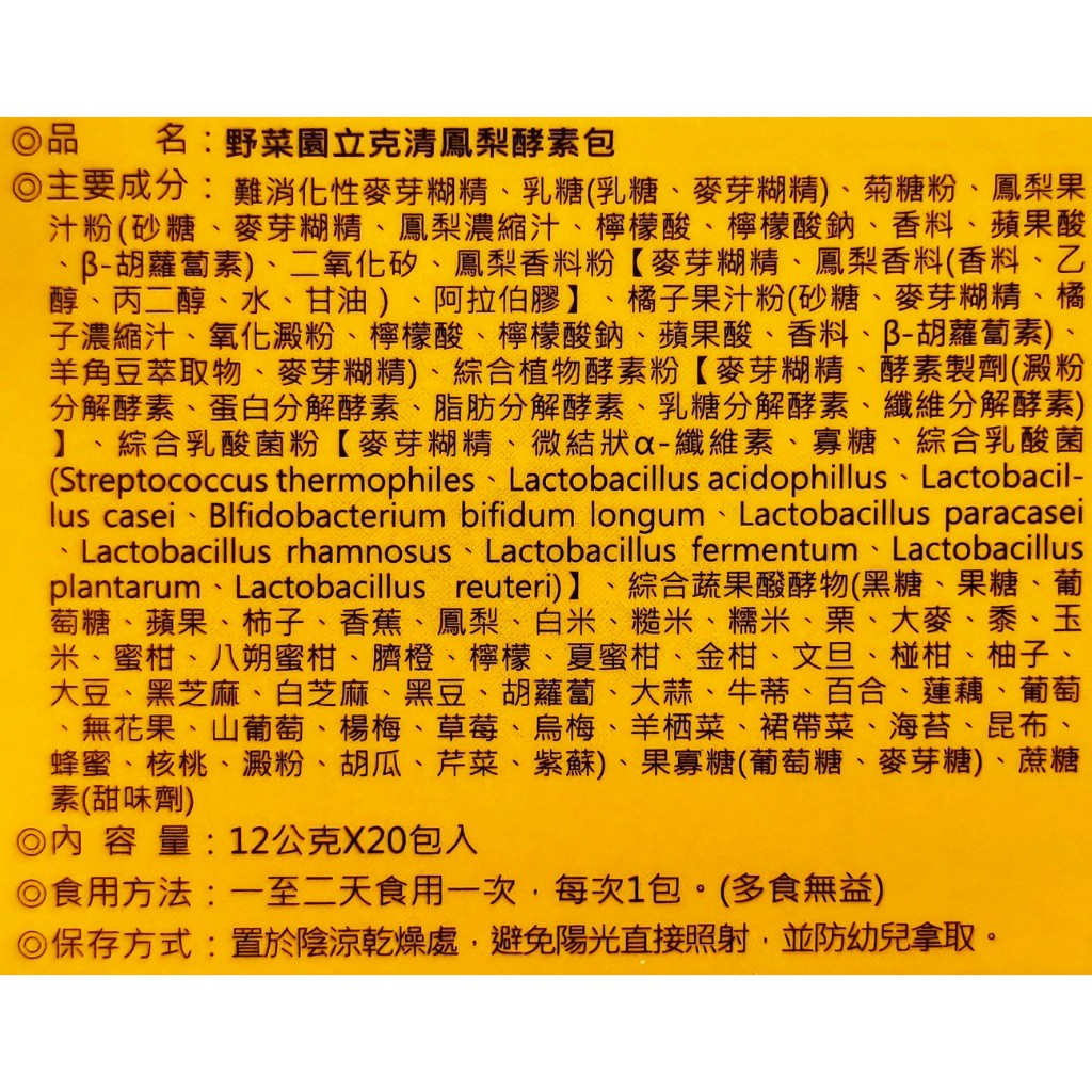 【野菜園】立克清鳳梨酵素包(20包/盒) 鳳梨口味,奶蛋素