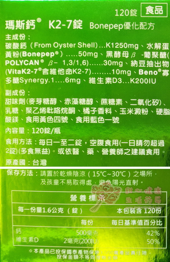 碳酸鈣K1250mg、水解蛋黃粉50mg、黑酵母葡聚糖30mg、維他命K2-7 10mg、維生素D3 K200IU